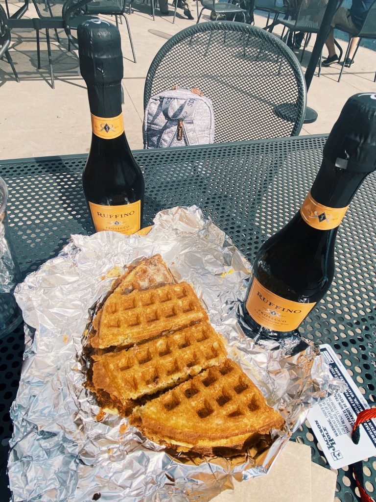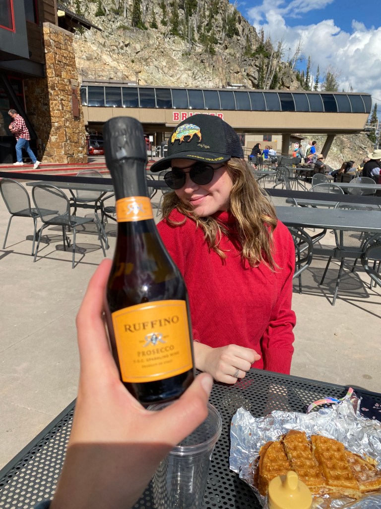 A restful morning! We woke up and stopped at Dornan’s and each grabbed a mini bottle of champagne to drink at the top of the gondola for later on in the day. We headed to town for the Arts Festival. We walked around and saw all of the local work and Nicole picked up a piece that she loved. After art-browsing, we decided to grab some food and margaritas at El Abuelito. It was delicious, per usual. From there, it was time to check out Teton Village. I showed Nicole around where I work as a market researcher and conveniently ran into some people from Brandon, Mississippi, too! We rode the gondola to the top and grabbed the most popular waffle there is! We popped our champagne, got out the orange juice we packed, and enjoyed mimosas and a brown sugar waffle. What a sight!