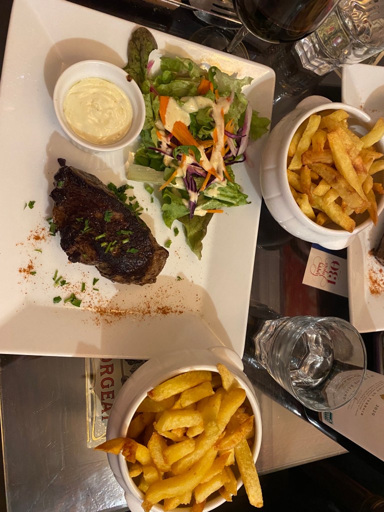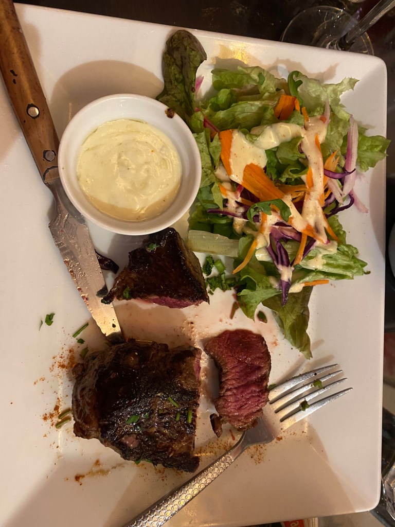 We did not care or take any offense but rather thought it was hilarious. He brought over an English menu and held it up for all 6 of us to look at. He explained the 3-course meal options or the other dinner options. Katelyn and I got a bottle of red wine and STEAK. I kid you not, the steak was absolutely delicious, and that is coming from a pretend vegan.