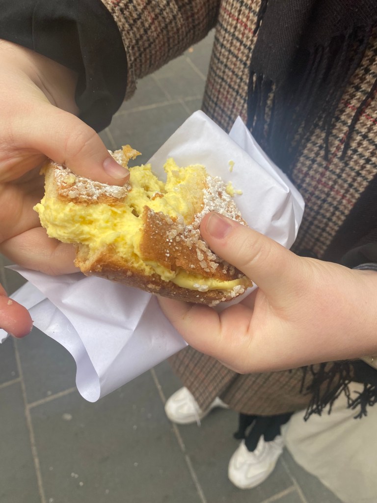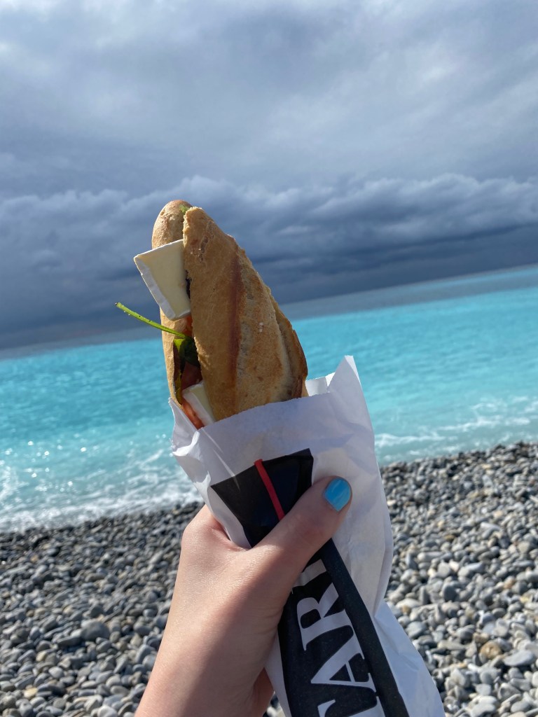 We grabbed a sandwich and headed to the water. Isn’t it so blue??? We also had to grab a pastry… There were just too many to not get one! We chose the tropézienne.