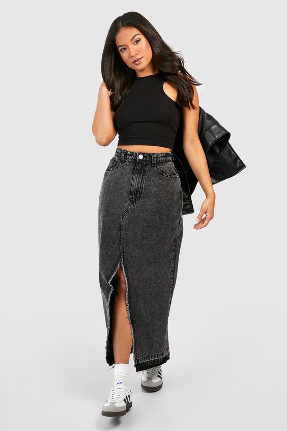 So, now that we have skirts and denim vests in the lineup, let’s combine them into one: The Long Denim Midi Skirt. Yep! That’s right. The midi denim skirt is trending in all colors. Denim, black denim, and white denim. I haven’t personally hopped on this trend yet, (and by that I mean wearing it) but I do think it is cute and a great summer to fall transition outfit. Here is some outfit inspo: