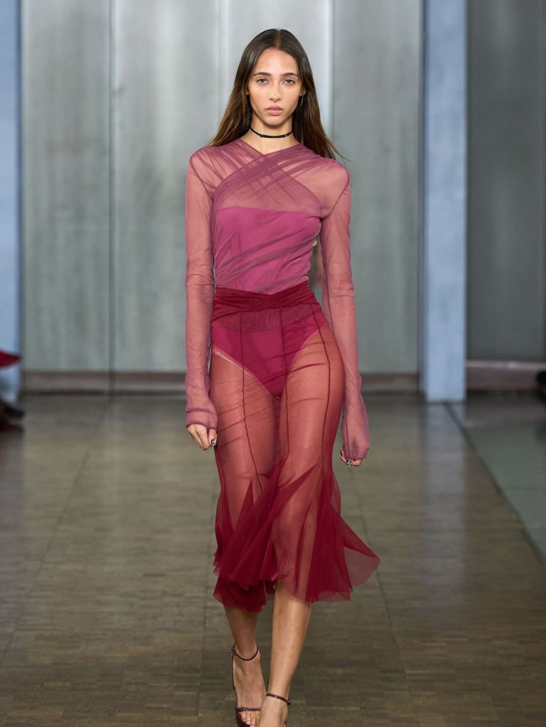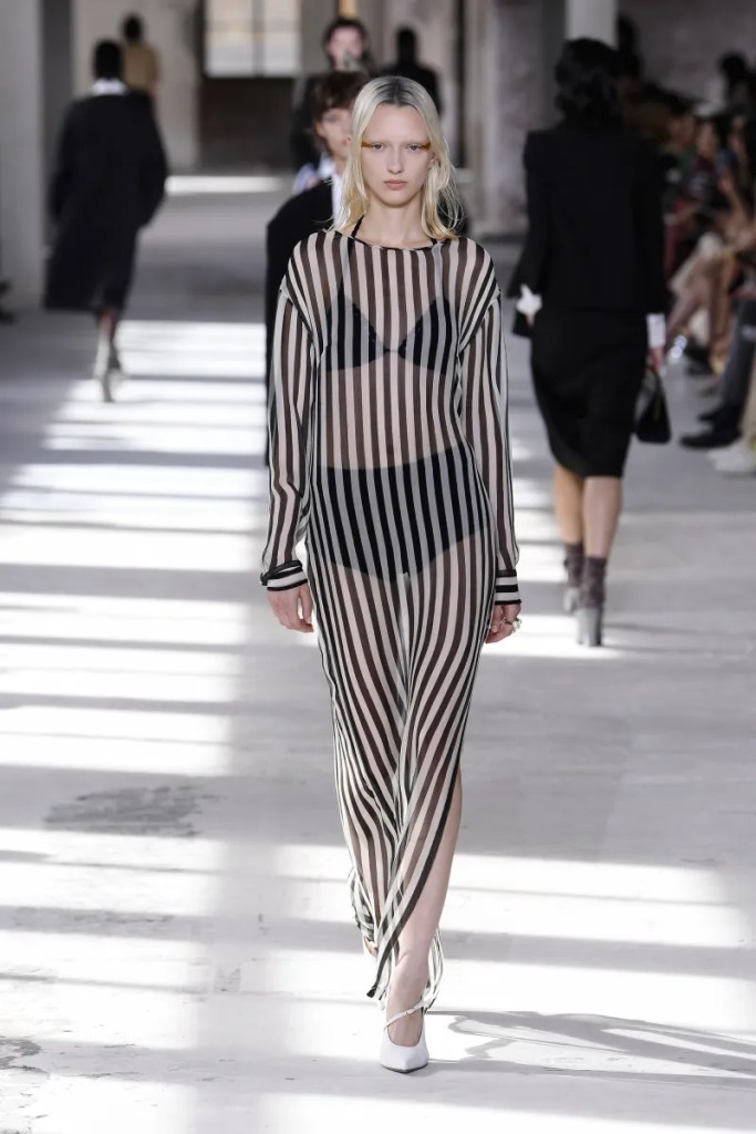 Spring’s all about lightness, and fashion’s taking that literally. This trend showcases mesh tops layered over bralettes. It also includes sheer skirts paired with high-waisted shorts. It’s all about playing with visibility in subtle, elegant ways. It is a great transition statement as cooler days turn into warm summer nights. Check out the look below: